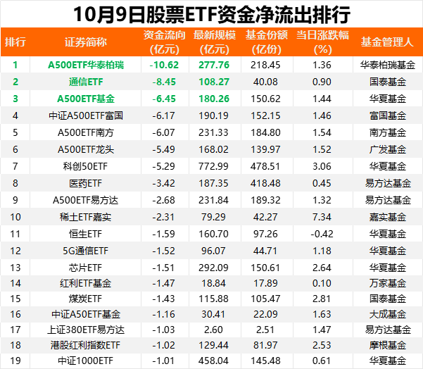 從凈流出方向看,中證A500指數(shù)ETF單日凈流出居前,達38.85億元;此外,通信、科創(chuàng)板50指數(shù)、港股寬基、紅利等指數(shù)ETF凈流出也較多。