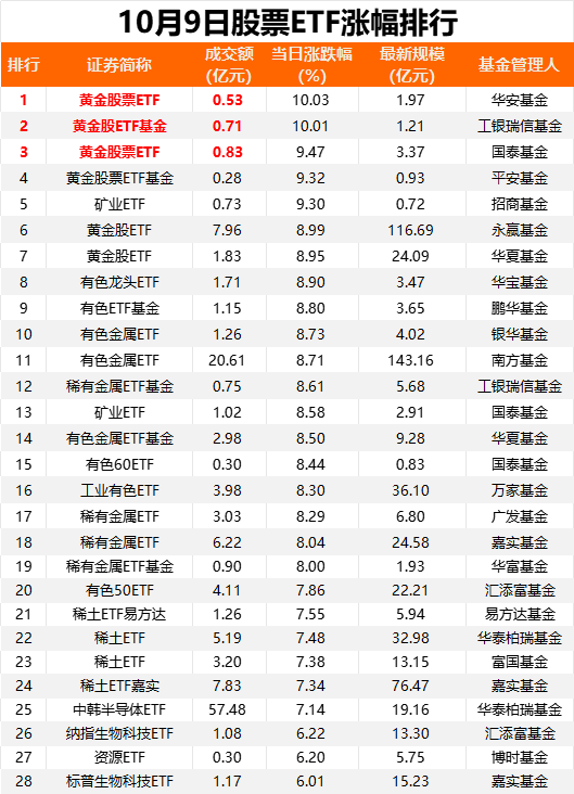 從股票ETF二級市場表現(xiàn)看,金價再創(chuàng)歷史新高,華安基金黃金股票ETF、工銀瑞信基金黃金股ETF基金尾盤漲停,國泰基金黃金股票ETF、平安基金黃金股票ETF基金漲超9%。有色板塊跟隨市場上揚,招商基金礦業(yè)ETF、華寶基金有色龍頭ETF分別漲9.3%、8.9%。