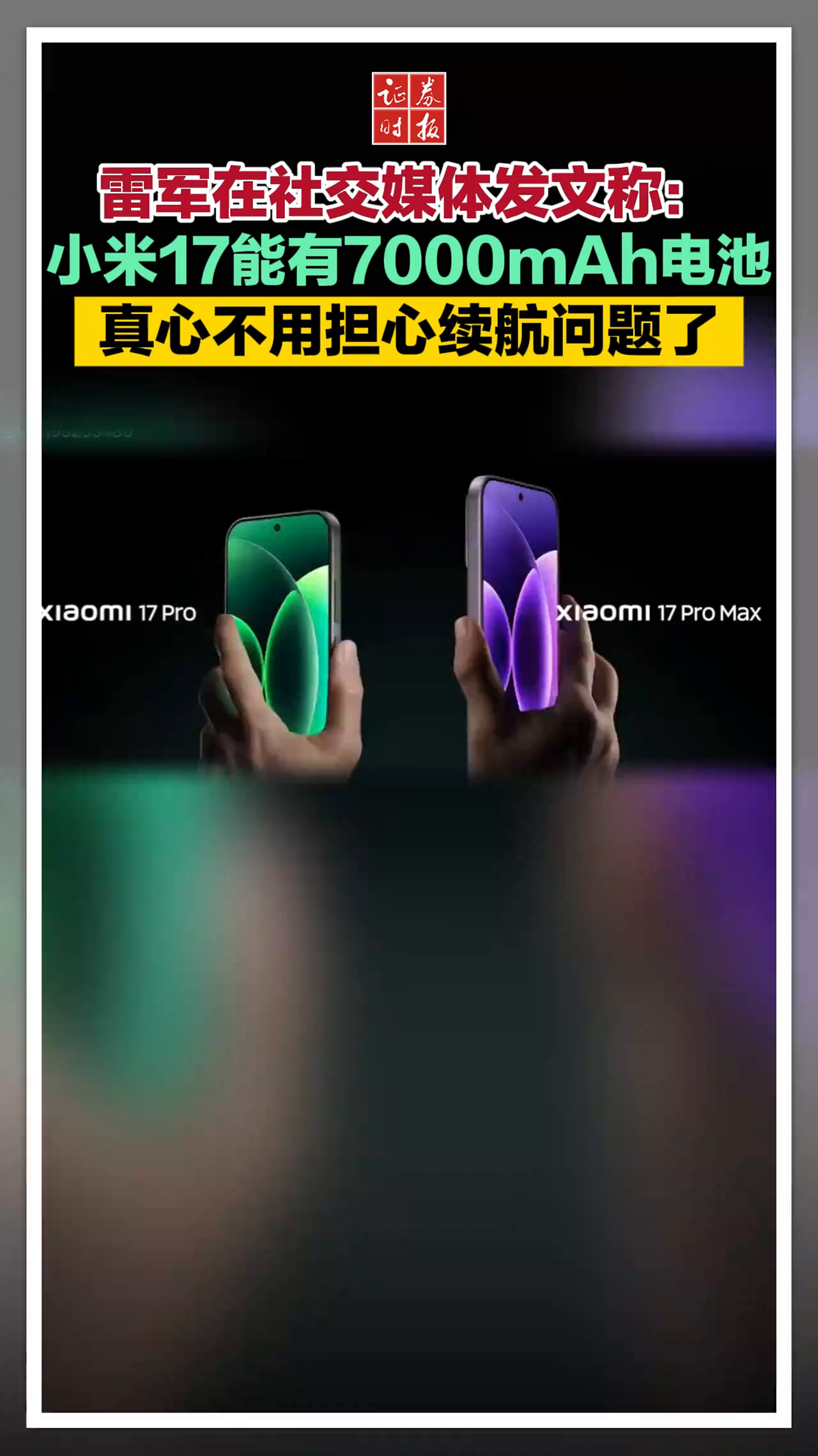 雷軍在社交媒體發(fā)文稱:小米17能有7000mAh電池 真心不用擔(dān)心續(xù)航問題了