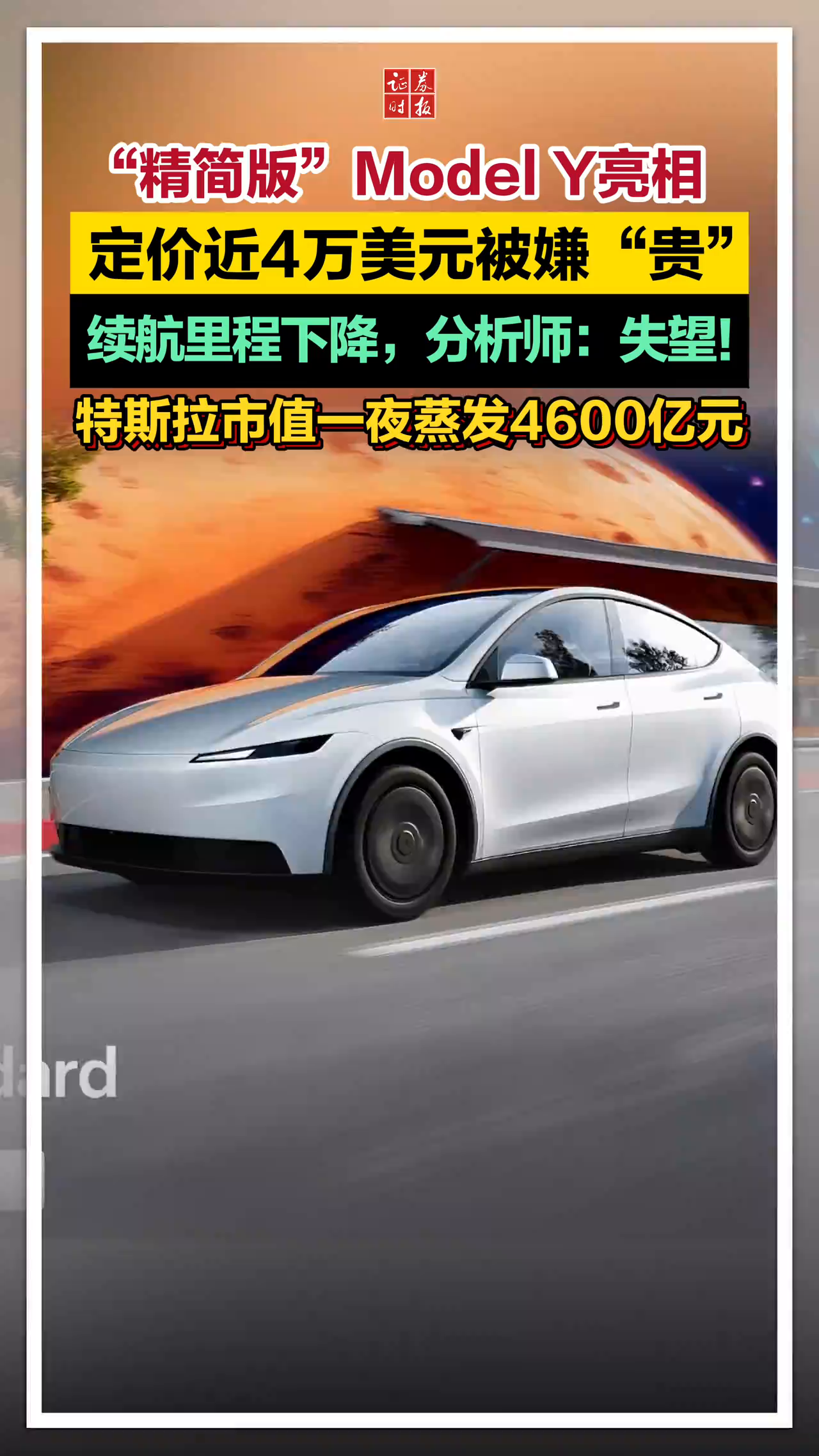 “精簡版”Model Y亮相,定價近4萬美元被嫌“貴”,續(xù)航里程下降,分析師:失望!特斯拉市值一夜蒸發(fā)4600億元
